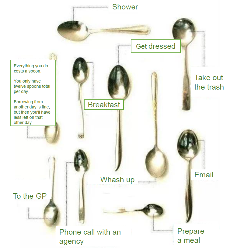 As a person with a brain injury and other energy-limiting conditions, you start your day with a limited amount of energy, a certain number of spoons. The number of spoons per day may vary. You use your spoons on activities throughout the day, and once they're gone, they're gone.