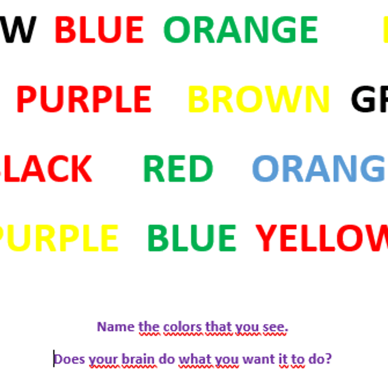 Does your brain do what you want it to do? Name the colors that you see, and keep up the pace ... do not appoint what you read. The real test is much longer and therefore more difficult to be consistent. It is called the Stroop experiment after its creator John Ridley Stroop.