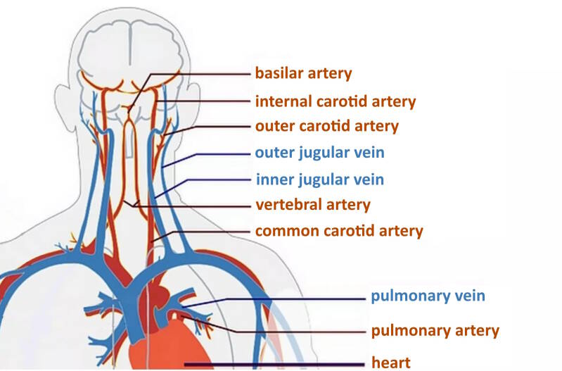 After which the oxygen-poor blood flows further and ends in the internal jugular vein (this runs in the neck).