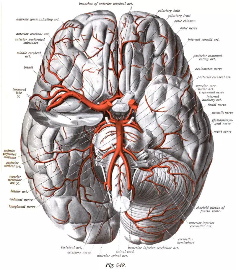 The cerebral blood vessels we are looking at in the images below lie in the confined space between the floor of the cranial cavity and the bottom of the brain.