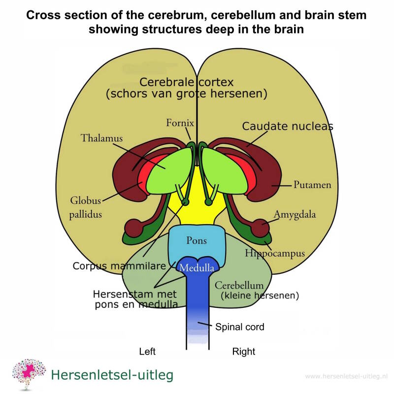 The cross-section below is when you view the brain from the back of the head, with the right hemisphere on the right and the left hemisphere on the left. Here you see the fornix in the middle.