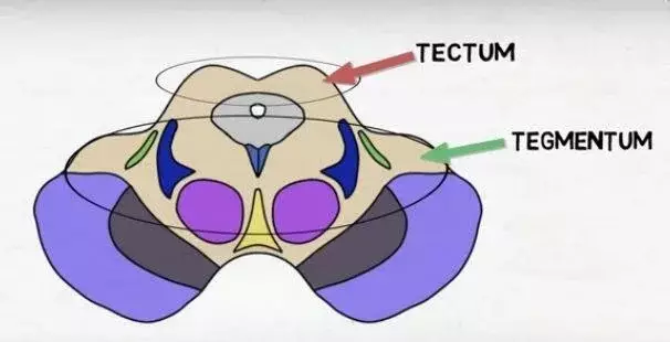 Image above: section through the middle of the mesencephalon at the level of the superior colliculus (upper bulge). The cerebral aqueduct is located on the back. The image below also shows a cross-section.