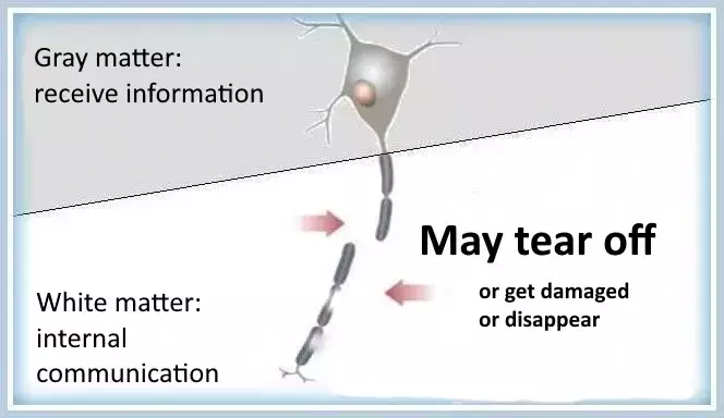 With brain injury, damage may have occurred in all these parts. An axon, for example, may have been torn off. Brain cells can then no longer communicate with each other or can no longer communicate with muscles and glands.